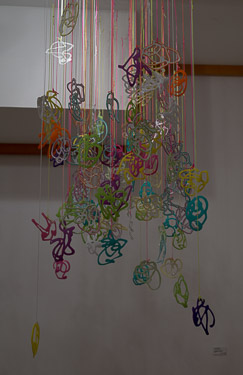 White acrylic paint on varied colors of EVA foam, nylon line, ~ 2' x 4'
