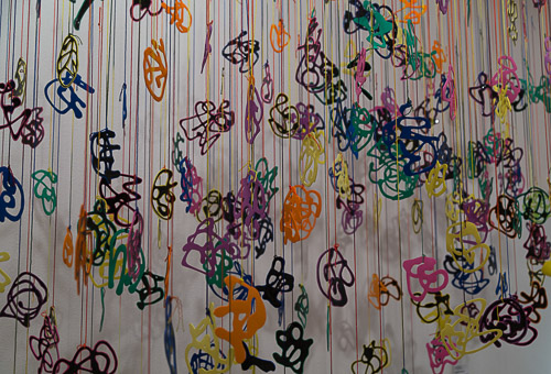Black acrylic paint on varied colors of EVA foam, nylon line, ~ 3' x 7'